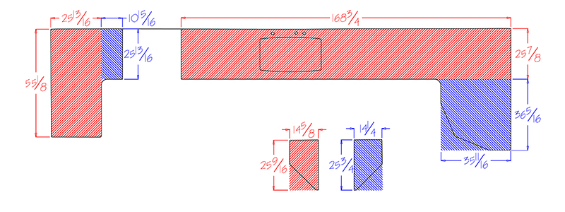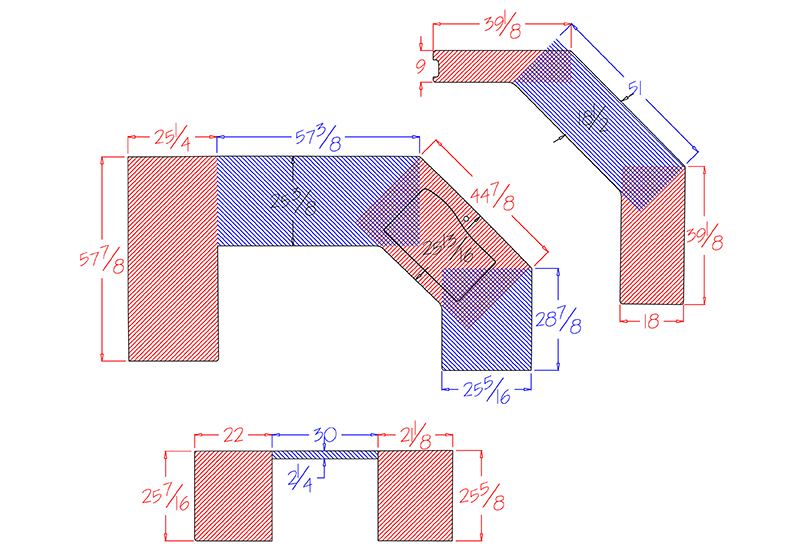 Batwing raised bars or kitchens with 45 degree walls can be figured by using the back wall dimenions as the lengths. These pieces will overlap, and that is okay because this material will be wasted when the job is fabricated and needs accounted for.